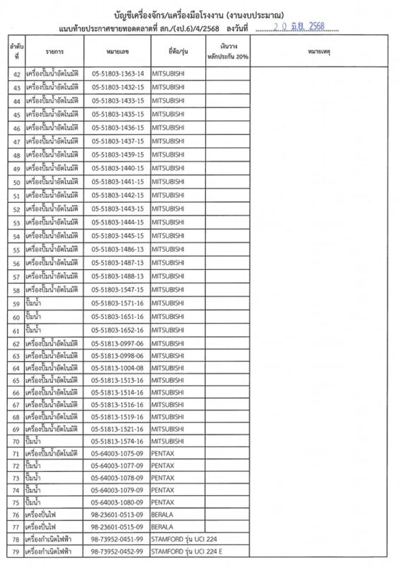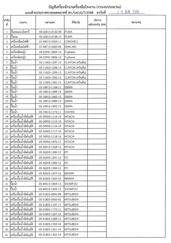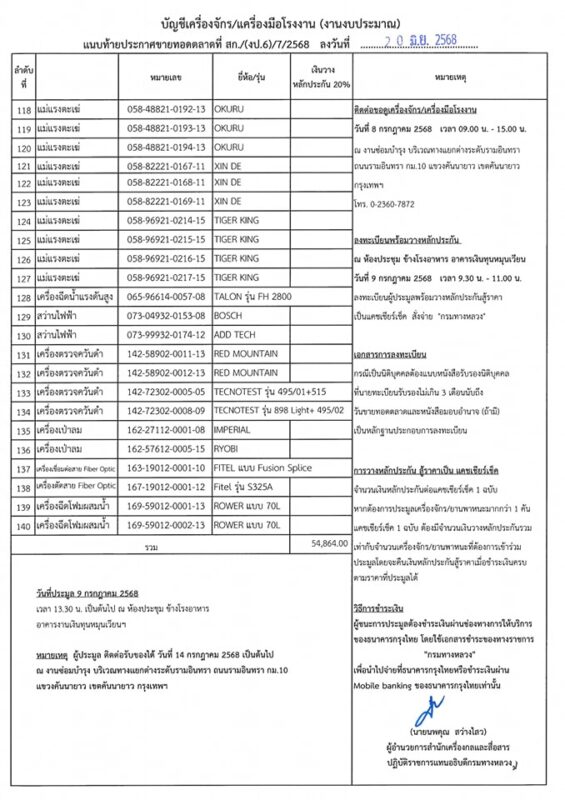 ประกาศขายทอดตลาด เครื่องจักร/เครื่องมือโรงงาน (งานงบประมาณ) ที่ สก./(งป.6)/7/2568 จำนวน 140 รายการ