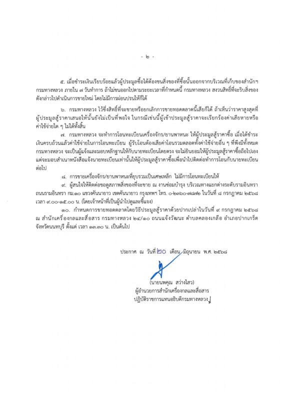 กำหนดการขายทอดตลาดโดยวิธีประมูลสู้ราคาด้วยปากเปล่าในวันที่ ๙ กรกฎาคม ๒๕๖๘